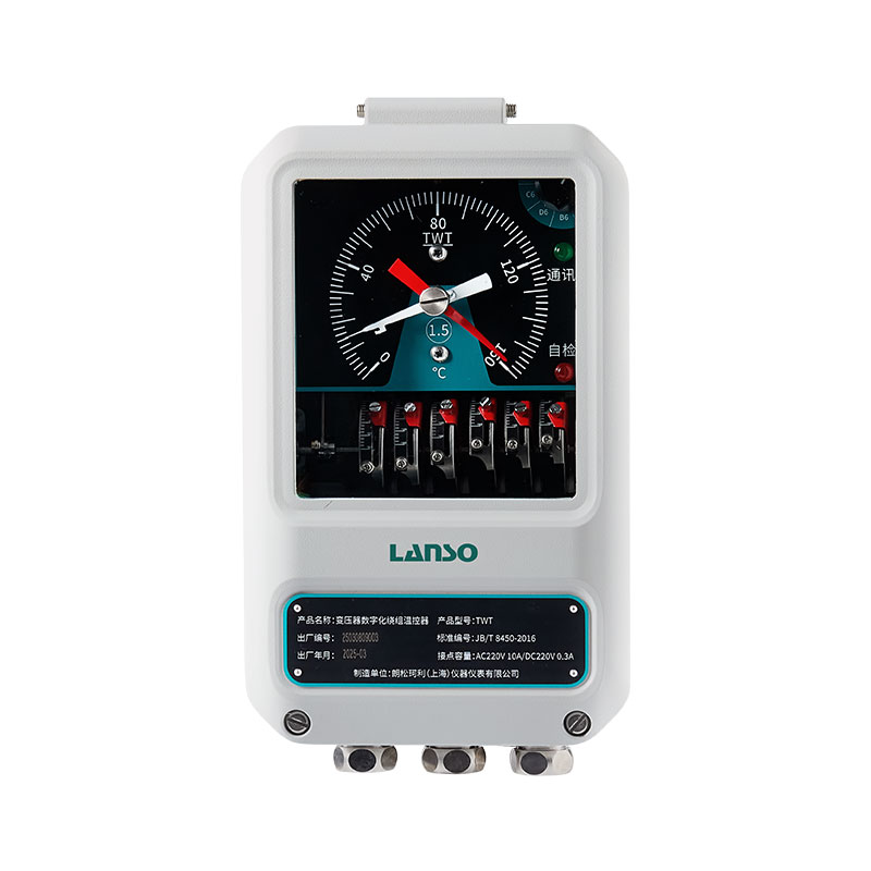 變壓器數(shù)字化繞組油溫計(jì)主要由機(jī)械部分和數(shù)字化感知單元組成。由彈性元件、傳感導(dǎo)管和感溫部件構(gòu)成的密封系統(tǒng)內(nèi)充滿感溫介質(zhì),當(dāng)被測(cè)溫度變化時(shí),感溫部件內(nèi)的感溫介質(zhì)的體積隨之變化,這個(gè)體積增量通過(guò)傳感導(dǎo)管傳遞到儀表內(nèi)彈性元件,使之產(chǎn)生一個(gè)相對(duì)應(yīng)的位移,并通過(guò)二次額定電流(TC)加熱推動(dòng)機(jī)構(gòu),實(shí)現(xiàn)二次溫升位移,這個(gè)位移的疊加經(jīng)機(jī)構(gòu)放大后便可指示被測(cè)繞組溫度,并驅(qū)動(dòng)微動(dòng)開關(guān),輸出開關(guān)控制信號(hào)來(lái)驅(qū)動(dòng)冷卻系統(tǒng),達(dá)到控制變壓器繞組溫度的目的。TWT型變壓器數(shù)字化繞組油溫計(jì)采用復(fù)合傳感技術(shù),通過(guò)裝在溫包內(nèi)的Pt100鉑電阻信號(hào)轉(zhuǎn)換成RS485數(shù)字化信號(hào)傳遞到控制室內(nèi)終端,能夠存儲(chǔ)10000條的監(jiān)測(cè)數(shù)據(jù)及運(yùn)行狀態(tài)信息并可導(dǎo)出,具有數(shù)據(jù)遠(yuǎn)傳功能、輸出報(bào)警或控制信號(hào),具備通信異常、自檢故障等本地指示功能,可以同步顯示和控制變壓器的頂層油溫 , 具有通訊電氣隔離、安裝方便、抗干擾能力強(qiáng)、可遠(yuǎn)程配置等優(yōu)勢(shì),實(shí)現(xiàn)了電力變壓器繞組溫度遠(yuǎn)程在線監(jiān)測(cè)功能。